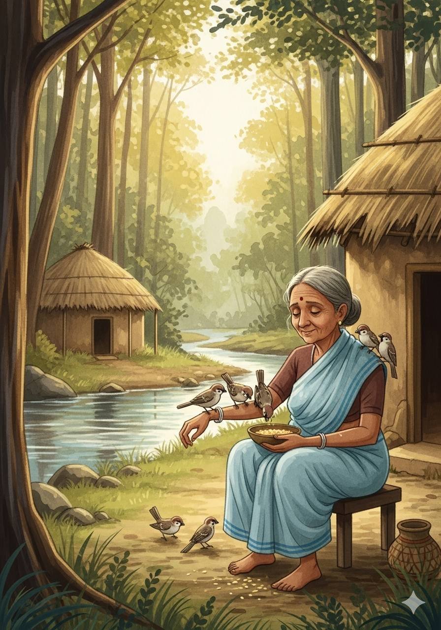 दादी बहुत दयालु थी। उनके सहारे कुछ चिड़ियाँ रहती थी। जिन्हें वह खाना दिया करती थी।